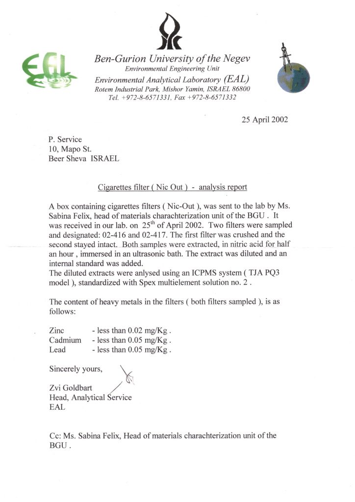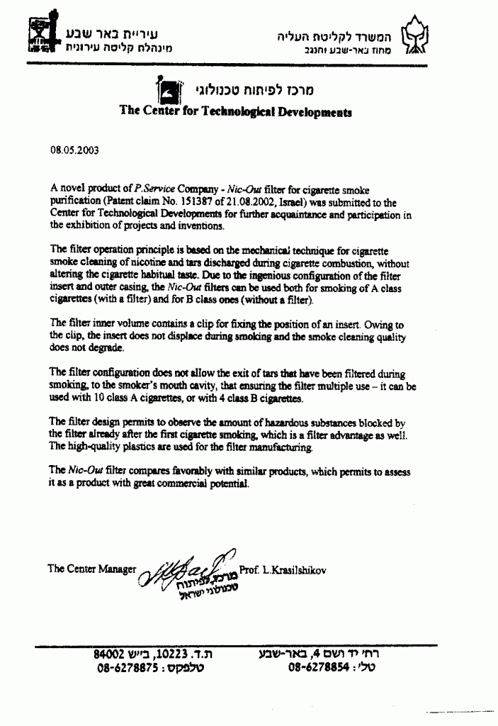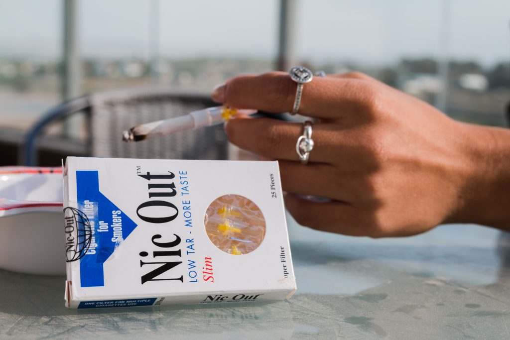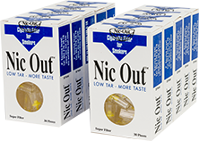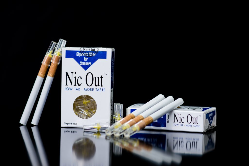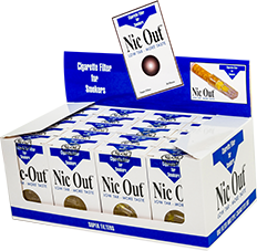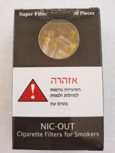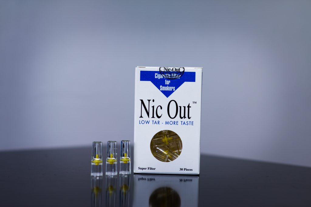 NIC- Out cigarette filter with a mechanical filtration system that is applied to the cigarette and selectively absorbs the large smoke particles of cigarette tar containing toxic compounds and other carcinogenic substances